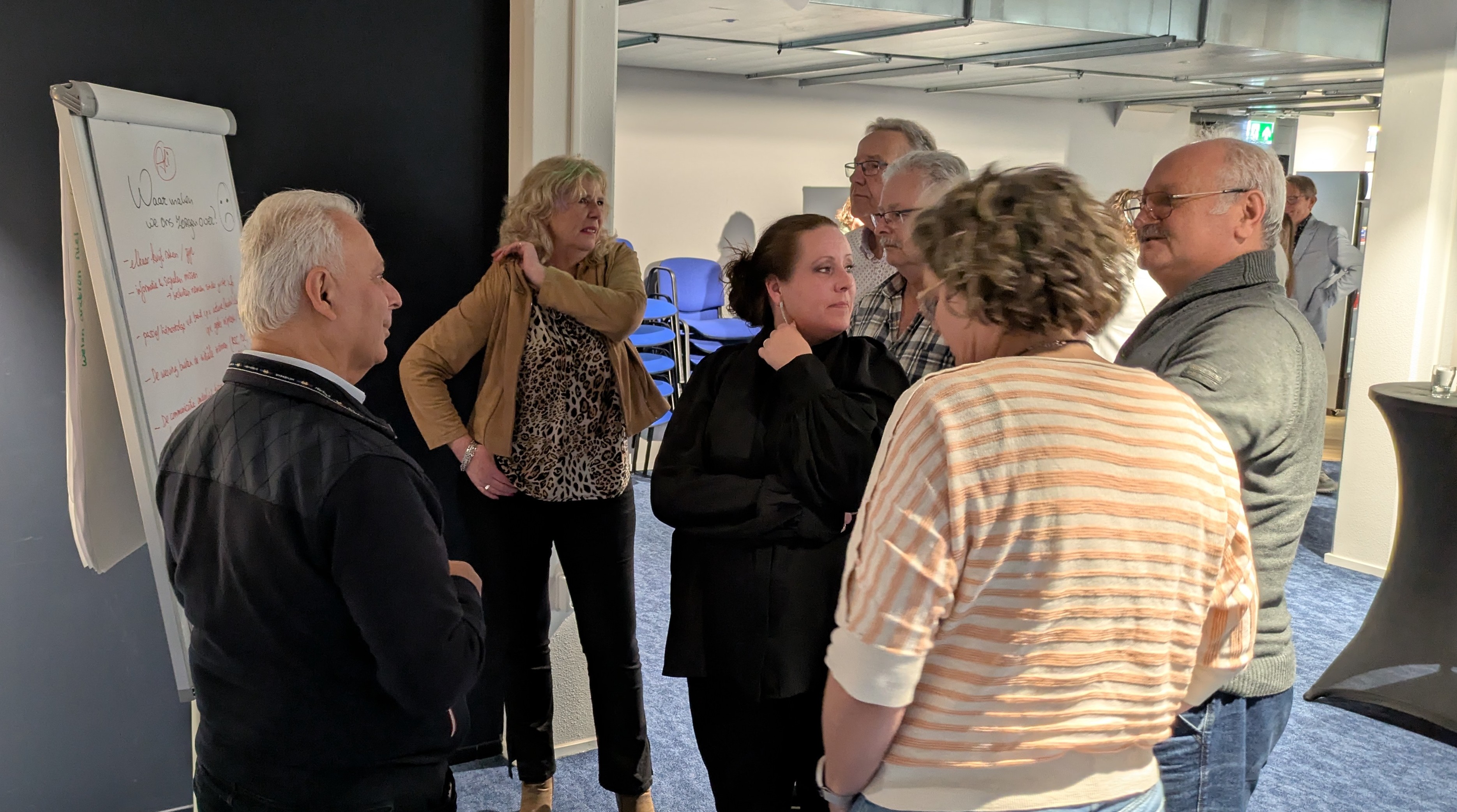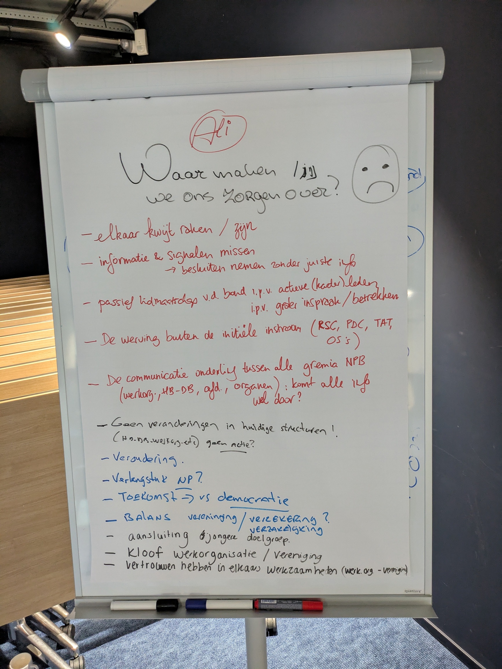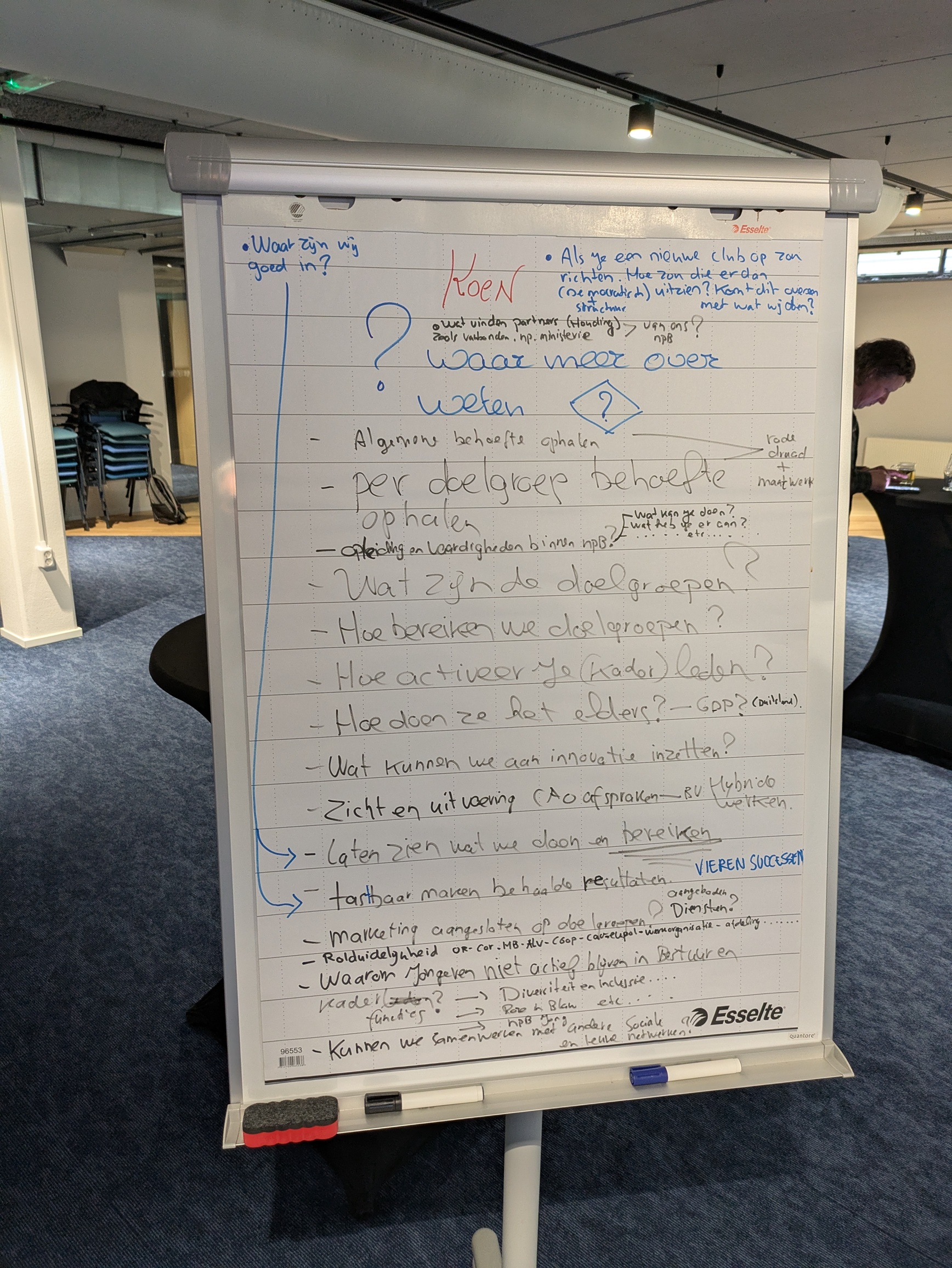 Daarna werden de deelnemers zelf aan het werk gezet. In de hoeken van de zaal had NPB-medewerker Rachid Zeddi vier flipovers geplaatst. Op elk bord stond een vraag en naast elk bord een onbezoldigde hoofdbestuurder. Het was de bedoeling dat onder de vraag antwoorden kwamen te staan, aangedragen door de aanwezigen en opgeschreven door de stiftvoerende hoofdbestuurder. De vier vragen luidden als volgt.
