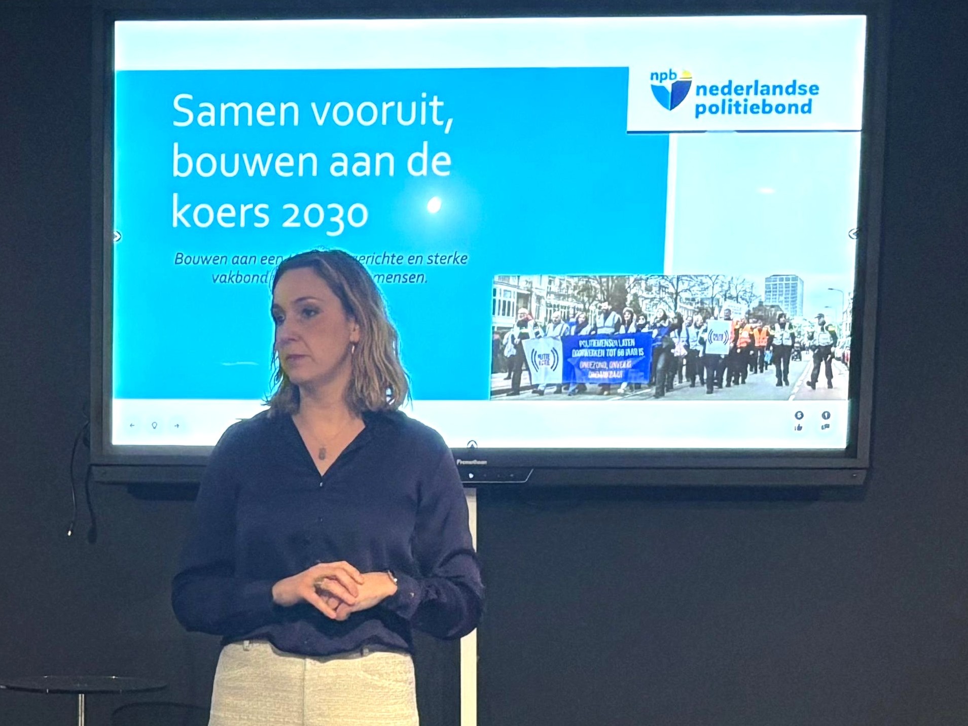 Vervolgens gaven Edith Lommerse en Ali Yentür een presentatie over hun visie op het bouwprogamma NPB2030. Ze vertelden dat het project een zoektocht was naar een heldere, toekomstbestendige koers voor ‘de NPB als vakbond én maatschappelijke beweging die bijdraagt aan een veilige, rechtvaardige en humane samenleving.’ Er moest gebouwd worden aan een nieuw fundament voor ‘een organisatie waar leden, bondsorganen en medewerkers samenwerken vanuit heldere rollen, gedeelde waarden en onderling vertrouwen.’