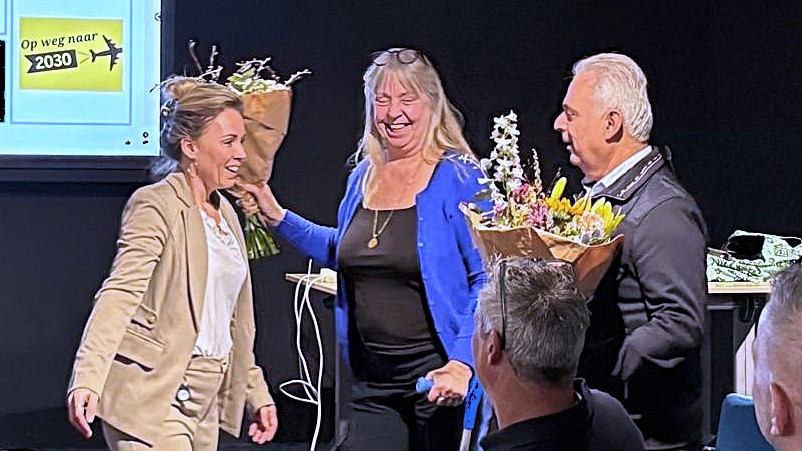 Aan het eind van hun presentatie kregen Edith Lommers en Ali Yentür van eenheidsbestuurder Annelot Tigchelaar een kleurrijk bosje bloemen overhandigd: ‘Een welverdiend blijk van waardering van het vele werk dat ze als onbezoldigde hoofdbestuurders verricht hebben om NPB2030 van de grond te krijgen.’