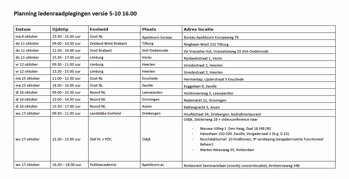 De vier politiebonden zijn al twee weken druk bezig met een reeks CAO-bijeenkomsten door het hele land. Ze presenteren daar het onderhandelingsresultaat voor een nieuwe politie-CAO en beantwoorden vragen van collega’s over de gemaakte afspraken. Ook de komende anderhalf week vinden nogal overal van die bijeenkomsten plaats.