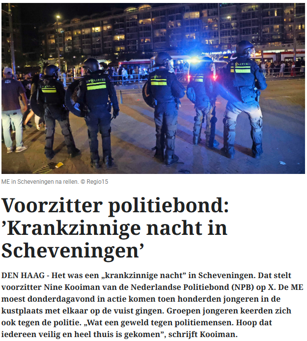De Telegraaf van 2 mei 2025: Het was een ‘krankzinnige nacht’ in Scheveningen. Dat stelt voorzitter Nine Kooiman van de Nederlandse Politiebond (NPB) op X. De ME moest donderdagavond in actie komen toen honderden jongeren in de kustplaats met elkaar op de vuist gingen. Groepen jongeren keerden zich ook tegen de politie. „Wat een geweld tegen politiemensen. Hoop dat iedereen veilig en heel thuis is gekomen”, schrijft Kooiman.