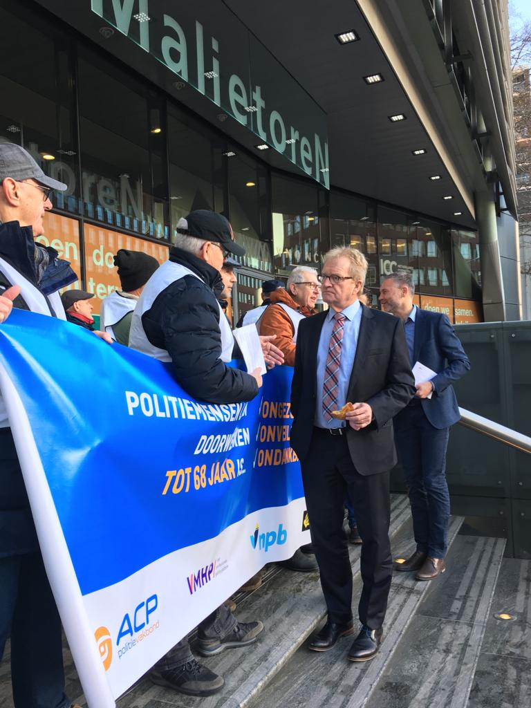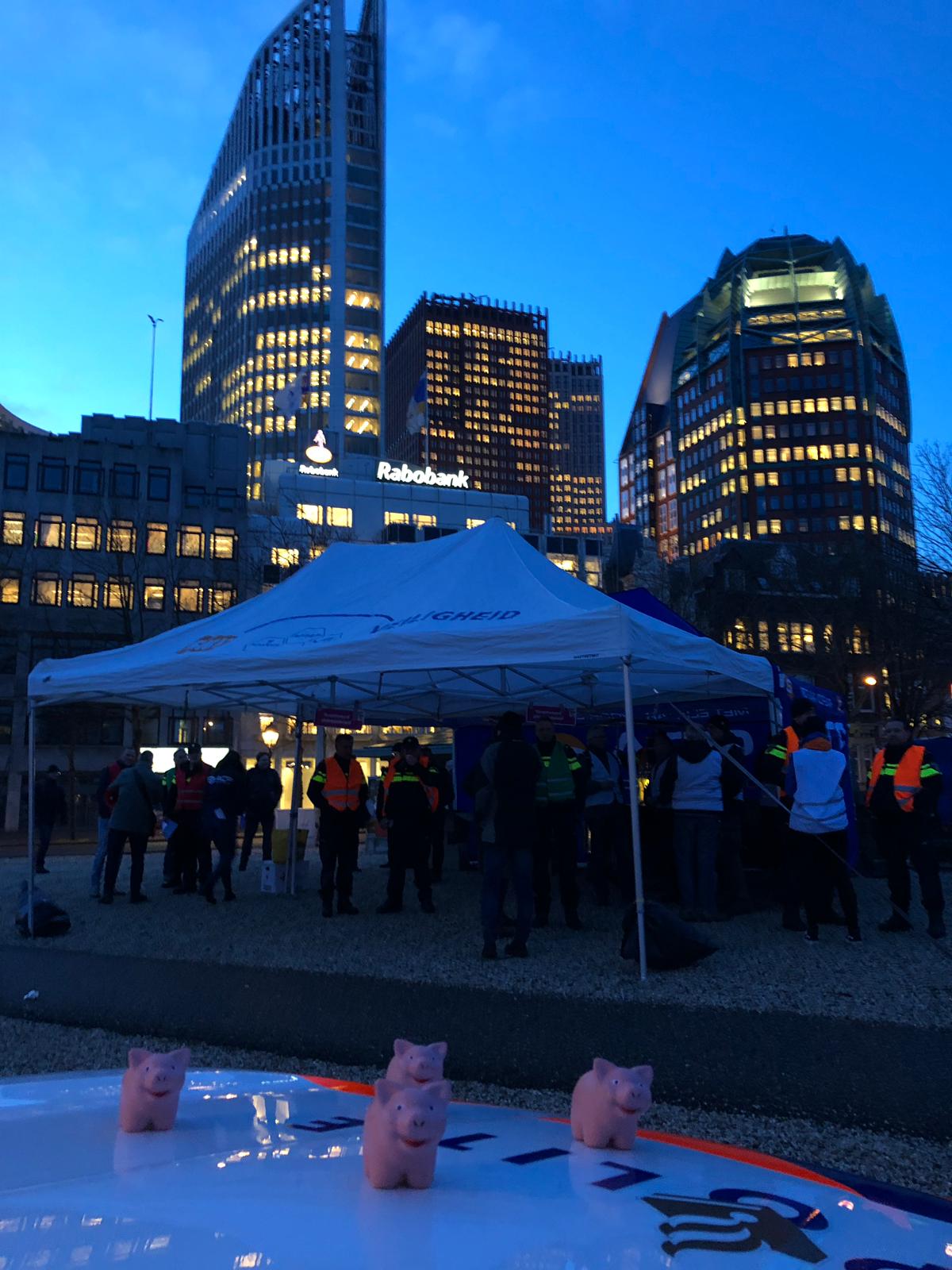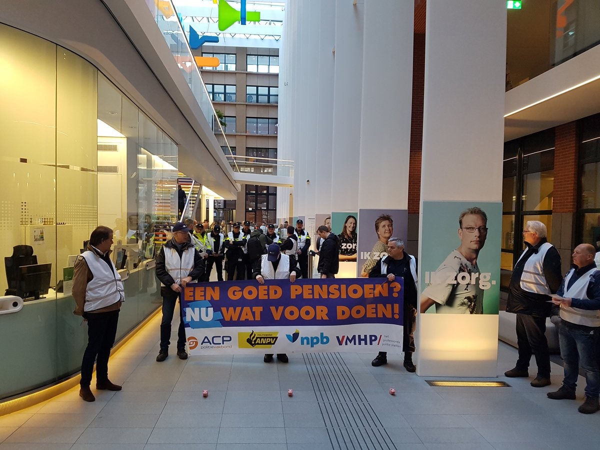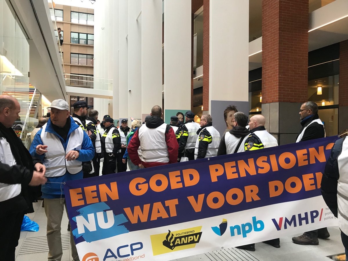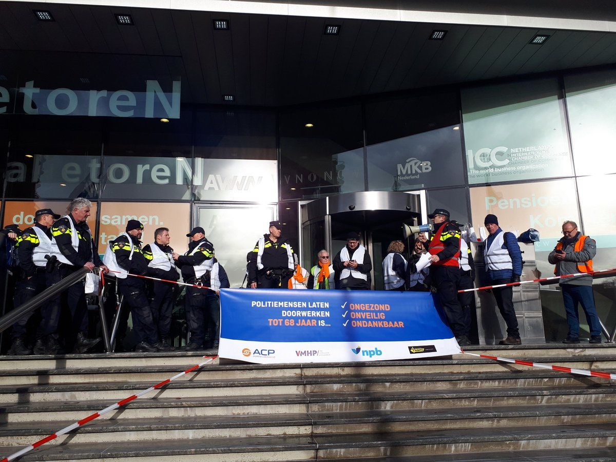 De politiebonden voerden vandaag gezamenlijk actie in Den Haag tegen het pensioenbeleid van het kabinet Rutte III. Het ministerie van Sociale Zaken en Werkgelegenheid EN het bolwerk van werkgeverskoepel VNO/NCW werden urenlang demonstratief geblokkeerd. BEKIJK de foto’s en de VLOG die NPB-bondssecretaris Nine Kooiman van de actie maakte!