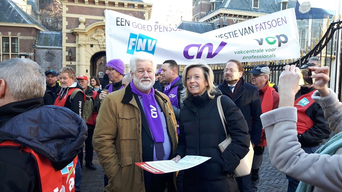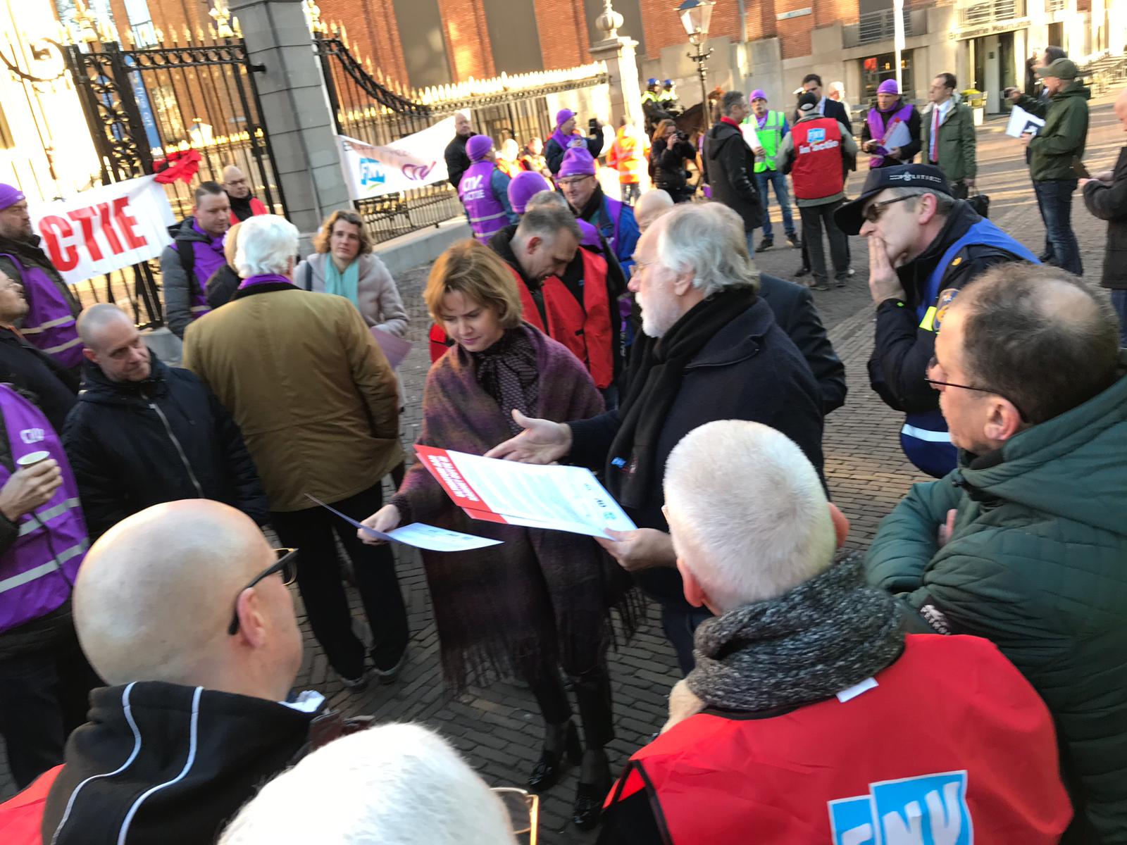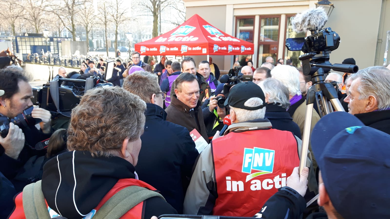 Op vrijdagochtend 15 februari hebben de vakcentrales FNV, CNV en VCP rondom het Binnenhof een demonstratieve actie gehouden tegen het pensioenbeleid van Rutte-III. Op weg naar de ministerraad werden leden van het kabinet geconfronteerd met de onvrede onder de Nederlandse burgers over het uitblijven van een rechtvaardige en sociale vernieuwing van het Nederlandse pensioenstelsel. Kijk hieronder voor de foto’s.
