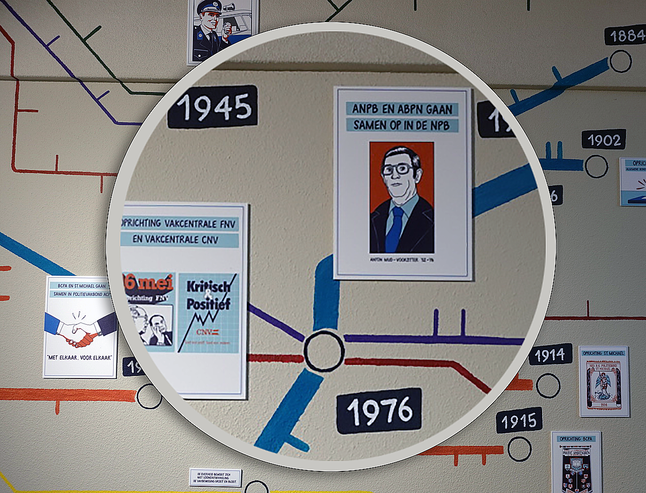 De tekening op de wand in het Huis van Veiligheid vertelt eigenlijk zijn vakbondsverhaal. Op het startpunt met de naam van voorzitter Anton Mud had ook ‘Dirk van Oostaijen’ kunnen worden toegevoegd. ‘In kleinere letters’, voegt de NPB-veteraan er meteen aan toe. Persoonlijk denk ik dat de wand wel een heel stuk verhoogd moet worden. Al pratend tekent mijn gesprekspartner er namelijk heel wat lijntjes bij.
