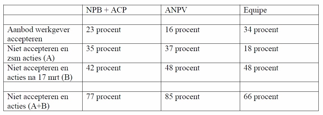 In totaal bleek van de gezamenlijke achterban van de NPB en de ACP dus 77 procent voor het verwerpen van het voorliggende afsprakenpakket en het starten van vakbondsacties. Van de deelnemende ANPV-leden bleek maar liefst 85 procent die mening toegedaan en van de deelnemende Equipe-leden 66 procent. Over de hele linie een ruime meerderheid dus.