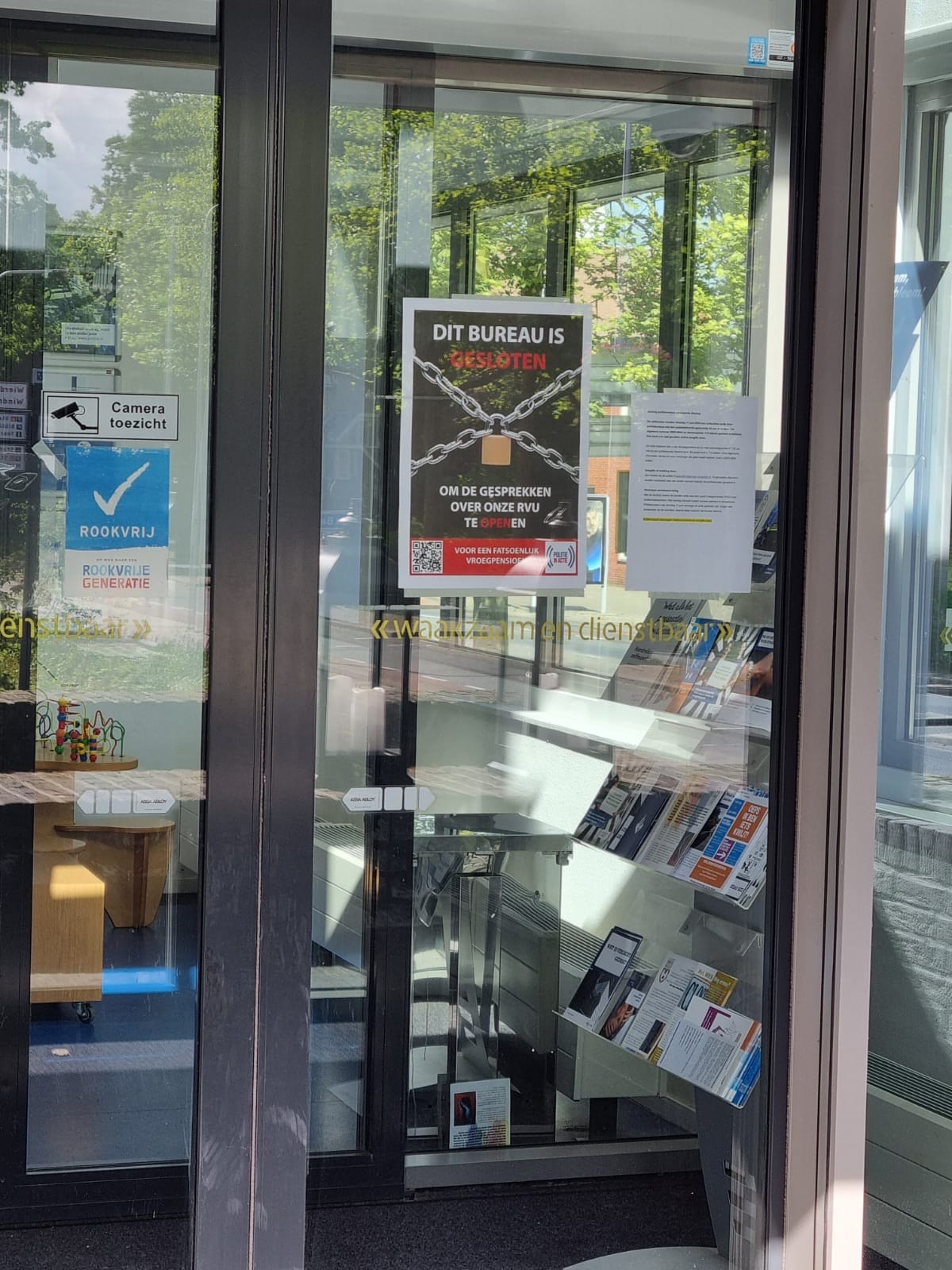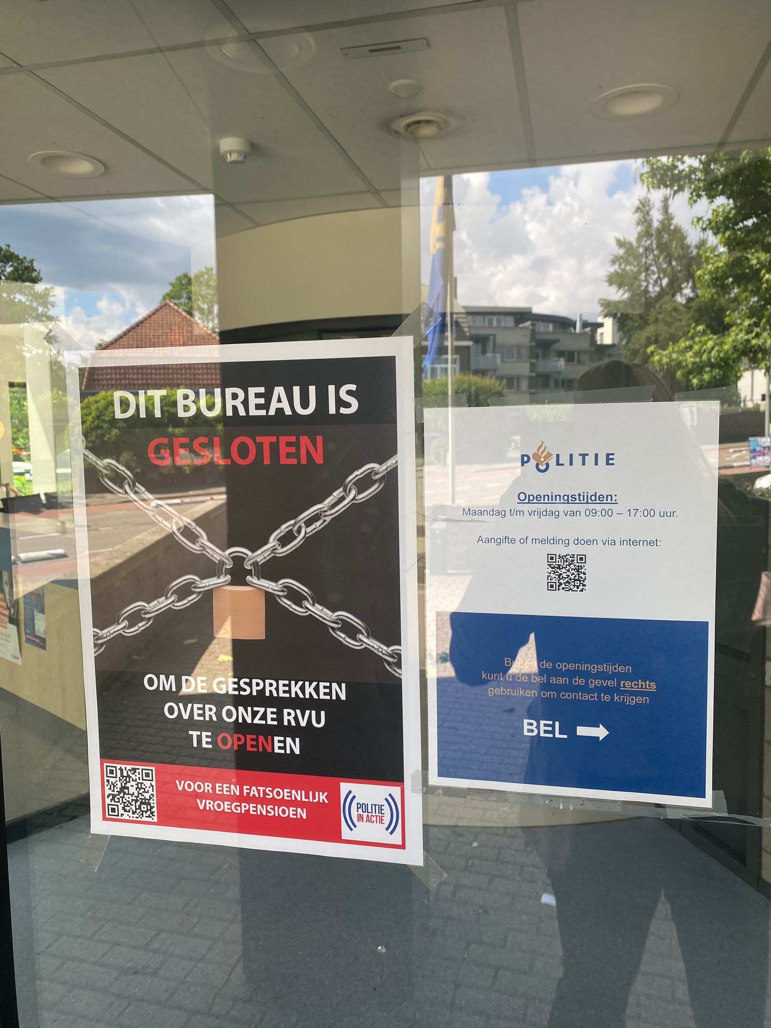 De politiebonden hebben hun leden opgeroepen vandaag de politiebureaus gesloten te houden voor het publiek. Ze doen dit uit protest tegen het uitblijven van politieke inspanningen om ook na 2025 een sociale uitstroomregeling (RVU) financieel mogelijk te maken voor politiemensen die tientallen jaren zwaar werk hebben gedaan. (Foto: bureau Zevenaar)