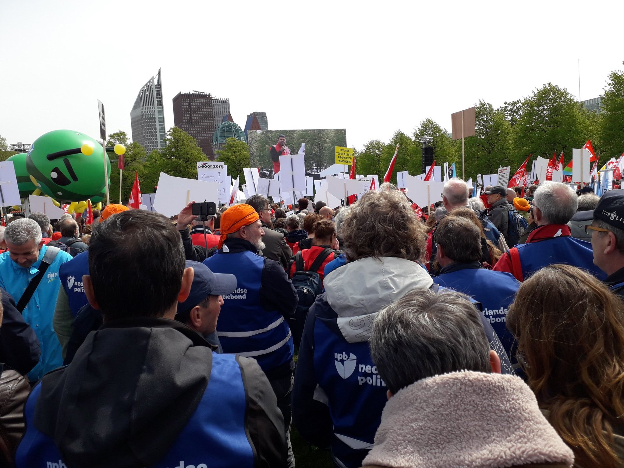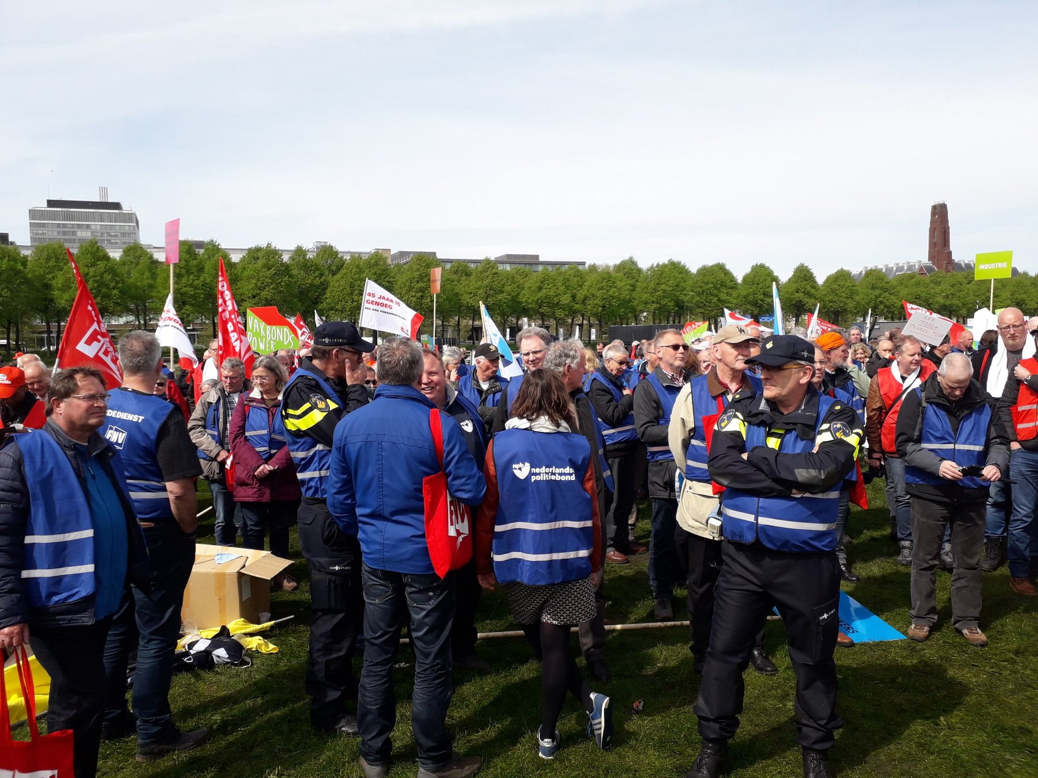 Onder een stralende meizon begaven de groepen actievoerders zich naar het gedeelte van het veld waar zij geacht werden zich op te stellen. In totaal waren er maar liefst 21 van deze ‘vakken’ voorzien, waarin soms meerdere beroeps- en/of belangengroepen waren samengevoegd. FNV Jong, Schiphol, schoonmaak, afval & milieu, Post NL, sociale werkplaatsen, FNV Handel, zorg, journalisten/cultuur & media, streekvervoer (op hun tweede stakingsdag), kinderopvang, jeugdzorg, uitkeringsgerechtigden, onderwijs, metaal, bouw, havens, industrie, politie, senioren/gepensioneerden – et cetera. Op het veld waren ruimschoots lunchpakketten beschikbaar en ook koffie, thee en water.