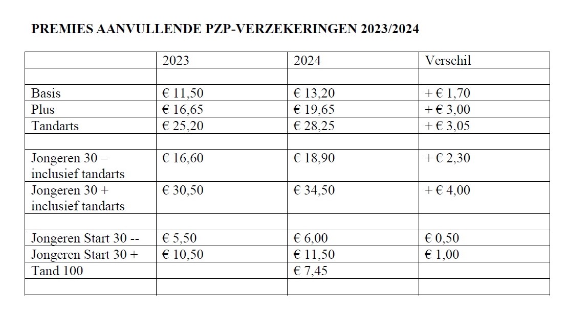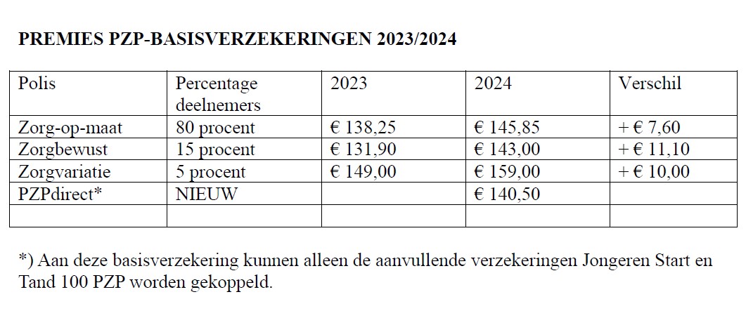 De premie voor de populairste PZP-basisverzekering (Zorg-op-maat) stijgt vanaf 1 januari 2024 met € 7,60 naar € 145,85 per maand. De premies van de aanvullende PZP-verzekeringen stijgen ook – met € 2 tot € 3 per maand. Dat levert voor deze extra verzekeringen geen kostendekkende premies op, maar de Stichting PZP Polis (= politiebonden) heeft CZ bereid gevonden dat verlies te nemen.
